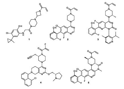 Figure 1 shows the chemical structures of reported KRAS^G12C inhibitors. These include ARS-853 (1) and ARS-1620 (2) from Araxes Pharma/Wellspring Biosciences; sotorasib (AMG 510, 3) from Amgen; adagrasib (MRTX849, 4) from Mirati Therapeutics; and compound 5 reported by AstraZeneca.